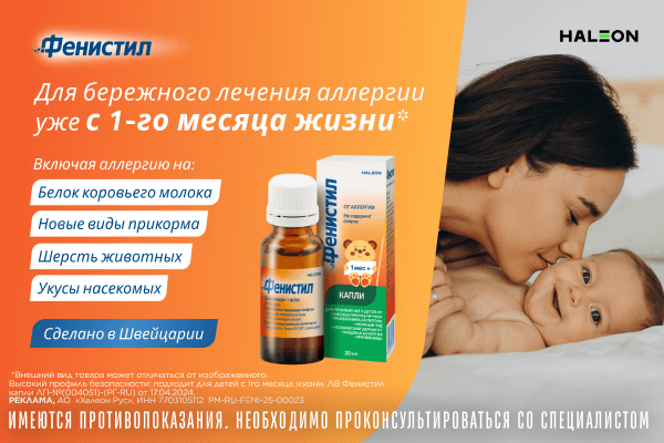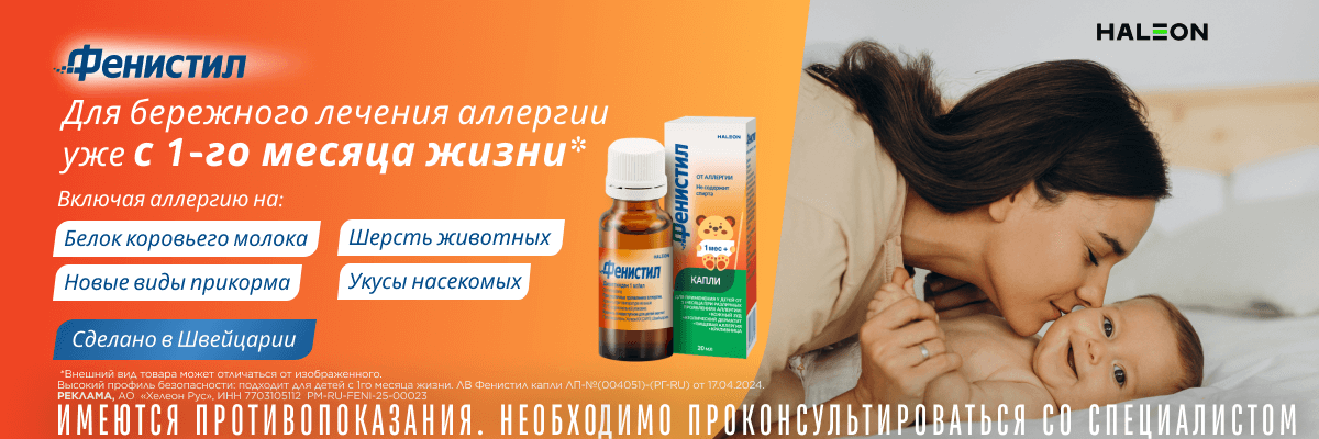 Препараты линейки Фенистил содержат диметиндена малеат — известное активное вещество, разрешённое к приёму у детей с 1-го месяца.6, 7